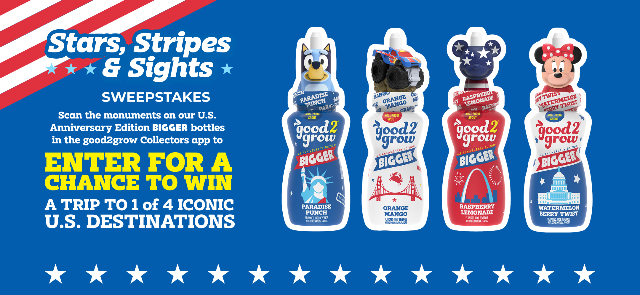 good2grow is honoring the 250th anniversary of America with a special limited-edition series of bottles featuring four iconic national monuments. We are giving you a chance to win a trip for 4 worth $5,000 to visit one of the four monuments so you can celebrate with your family, too!