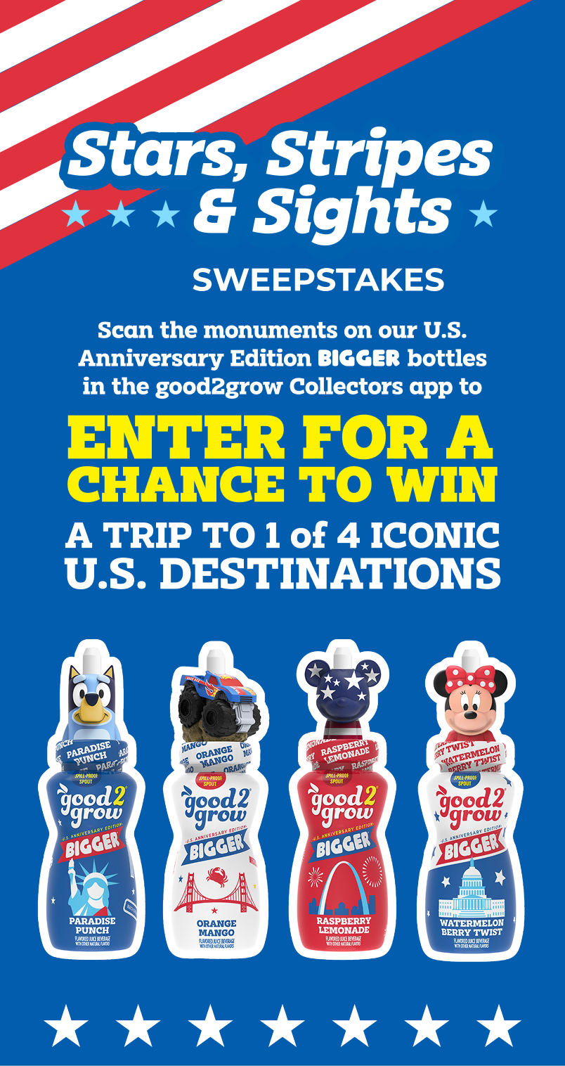 SWEEPSTAKES PERIOD: The good2grow® Stars Stripes and Sights Sweepstakes (the “Sweepstakes”) begins at 12:00:01 a.m. Eastern Daylight Time (“EDT”) on April 1, 2026, and ends at 11:59:59 p.m. EDT on September 30, 2026 (the “Sweepstakes Period”). By participating, entrants agree to be bound by these Official Rules and the decisions of good2grow® (the “Sponsor” and/or the “Administrator”), which are binding and final on all matters relating to this Sweepstakes. ELIGIBILITY: The Sweepstakes is open and offered only to legal residents of the 50 US and D.C., who are eighteen (18) years of age at time of entry in their state of residence at the time of entry (“Entrants”). Employees, officers and representatives of the Sponsor, the Administrator, and any of their respective parent companies, affiliates, brand prizing partners, franchisees, licensees, distributors, suppliers, subsidiaries, retailers, advertising/promotion agencies and members of their immediate families (mothers, fathers, brothers, sisters, sons, daughters and spouses, regardless of where they reside) and household members of each such employee, officer or representative whether or not related, are not eligible to participate. “Household members” shall mean people who share the same residence at least three (3) months a year. Winning a Prize is contingent on fulfilling all requirements in these Official Rules. All federal, state, and local laws and regulations apply. Void where prohibited or restricted. All Sweepstakes Entries are the sole and exclusive property of the Sponsor.