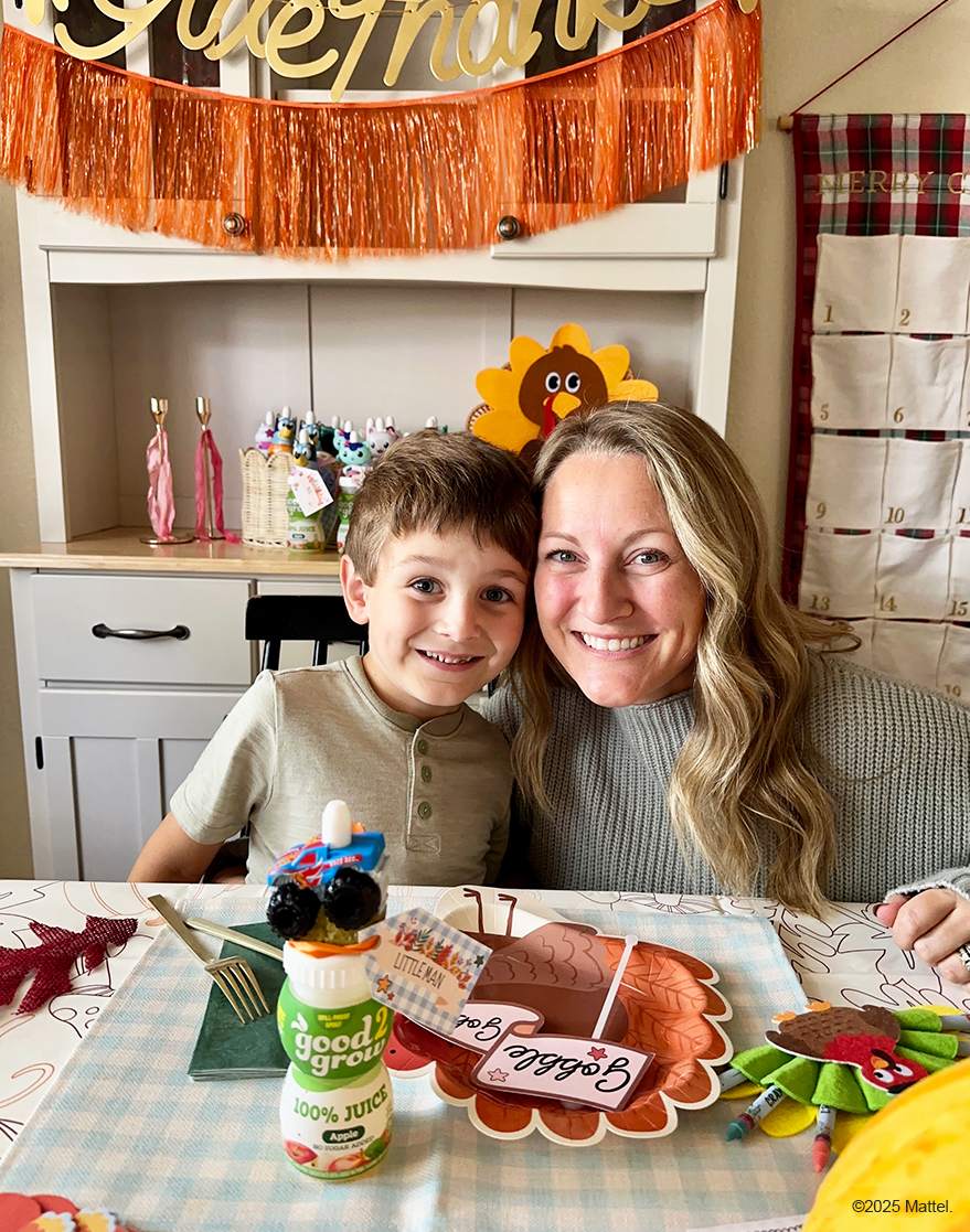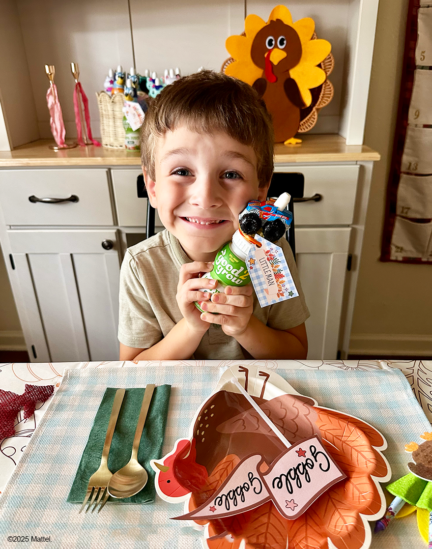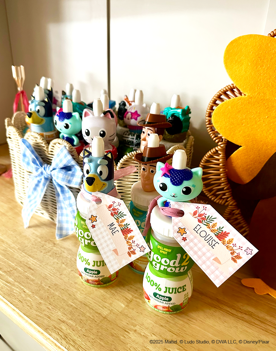 Bring smiles to Turkey Day with a kids’ table made just for them. Crafty mom, Whimsically Wonderful created a cute and crafty setup complete with homemade tags, a custom thankfulness journal, and good2grow bottles topped with their favorite characters to make each seat feel extra special.