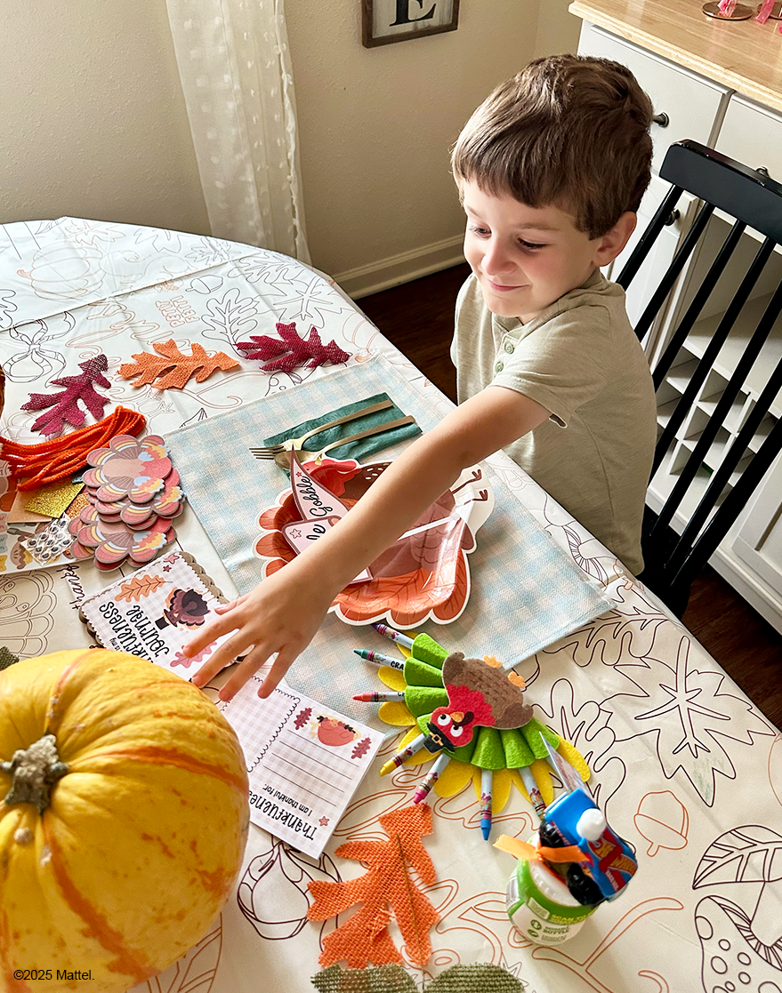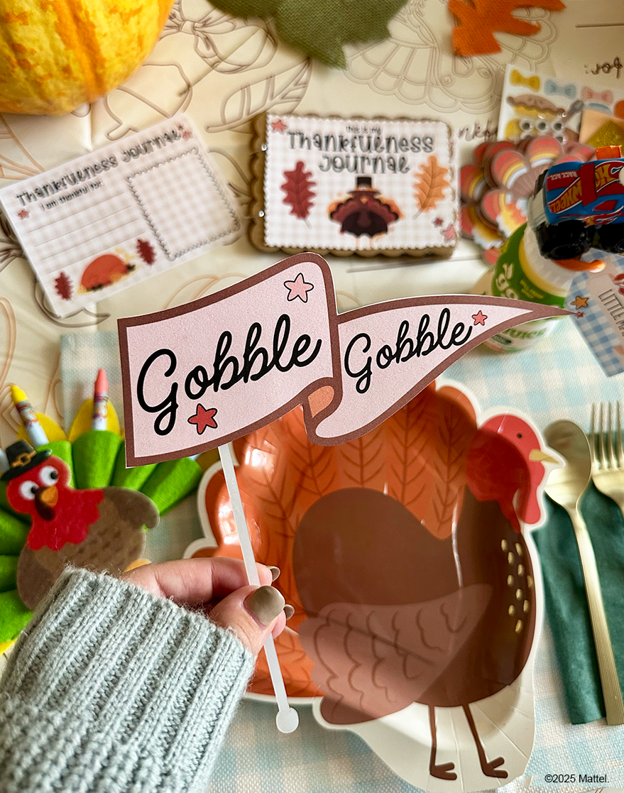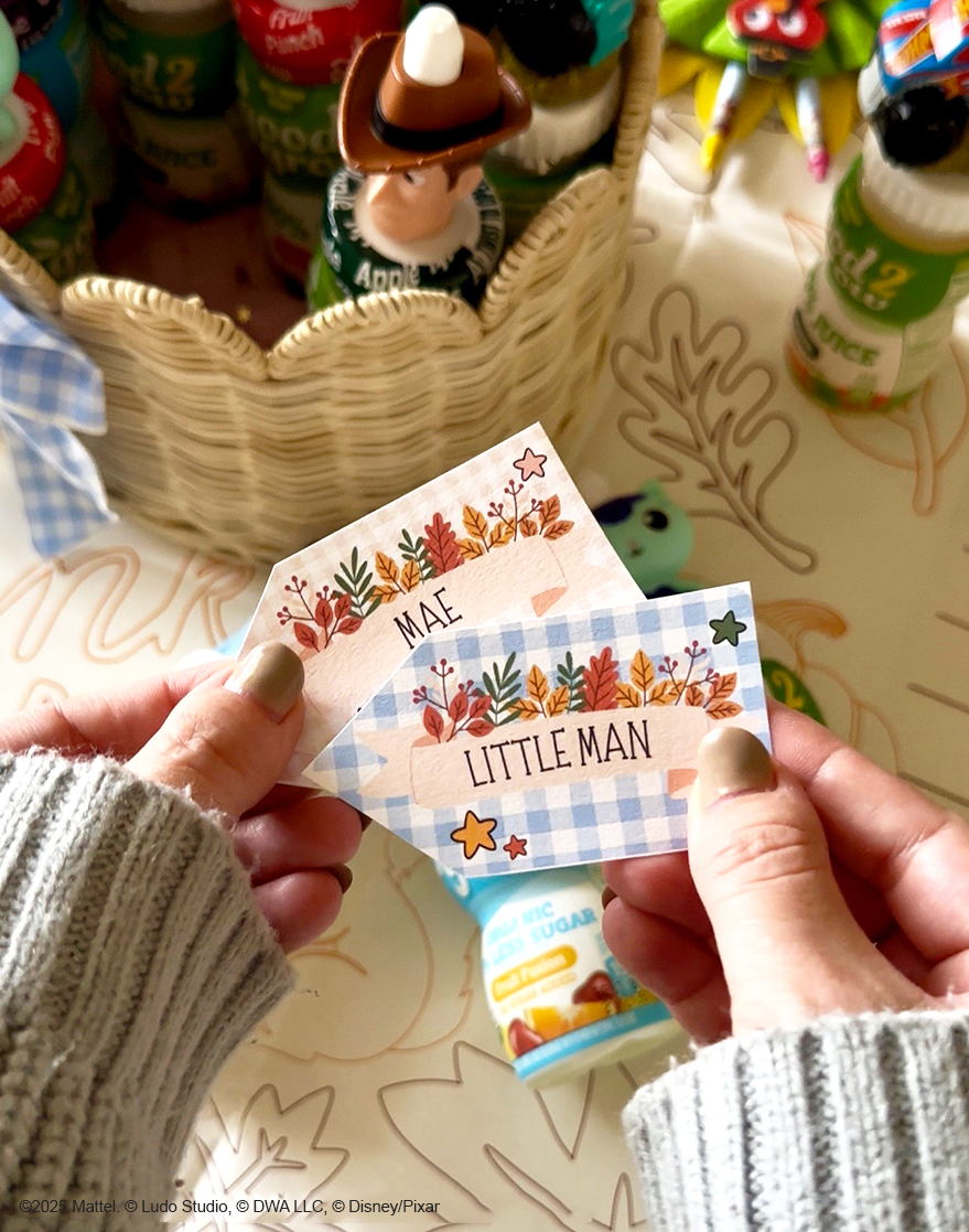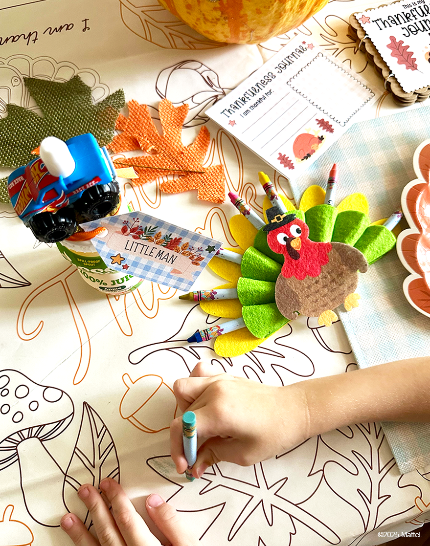 Bring smiles to Turkey Day with a kids’ table made just for them. Crafty mom, Whimsically Wonderful created a cute and crafty setup complete with homemade tags, a custom thankfulness journal, and good2grow bottles topped with their favorite characters to make each seat feel extra special.